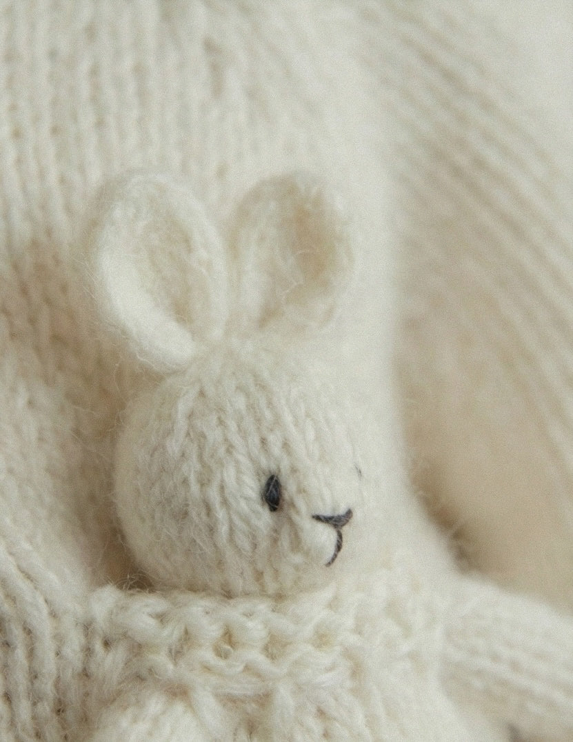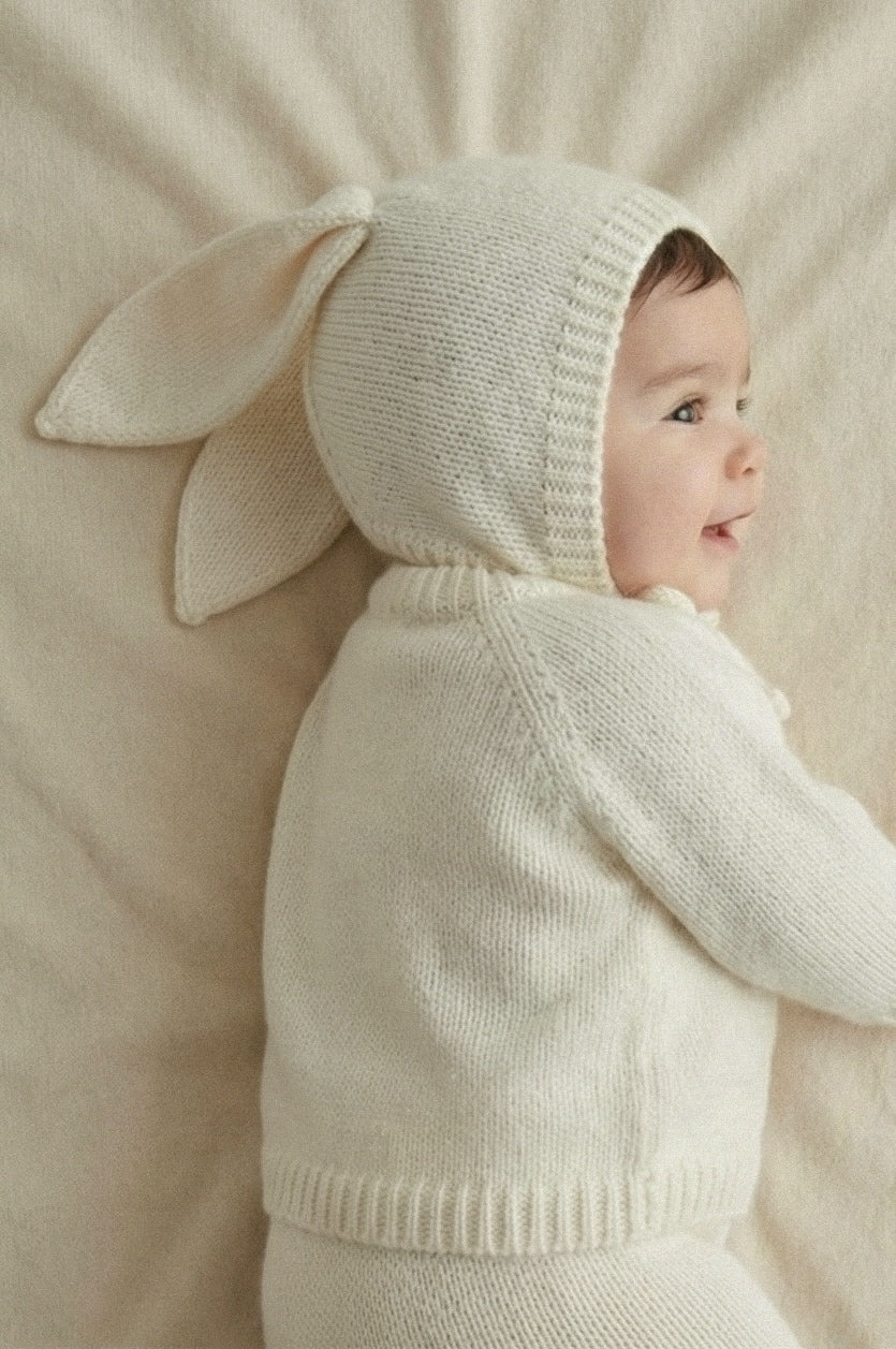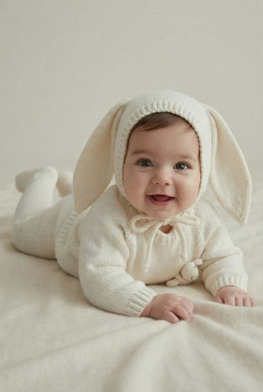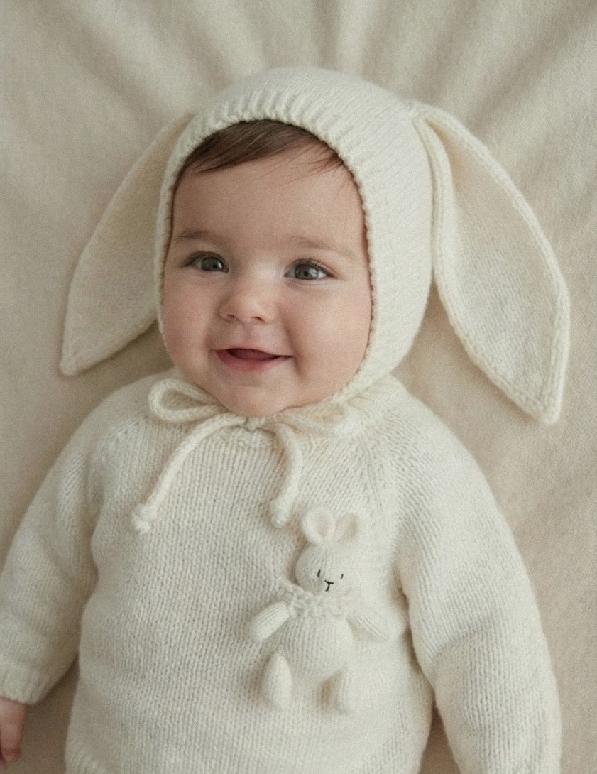 The Riley Ensemble is available in white and oat color. It's coming with a Bunny Bonnet, Sweater with a little bunny friend and tights, to keep babies feet soft and snug.