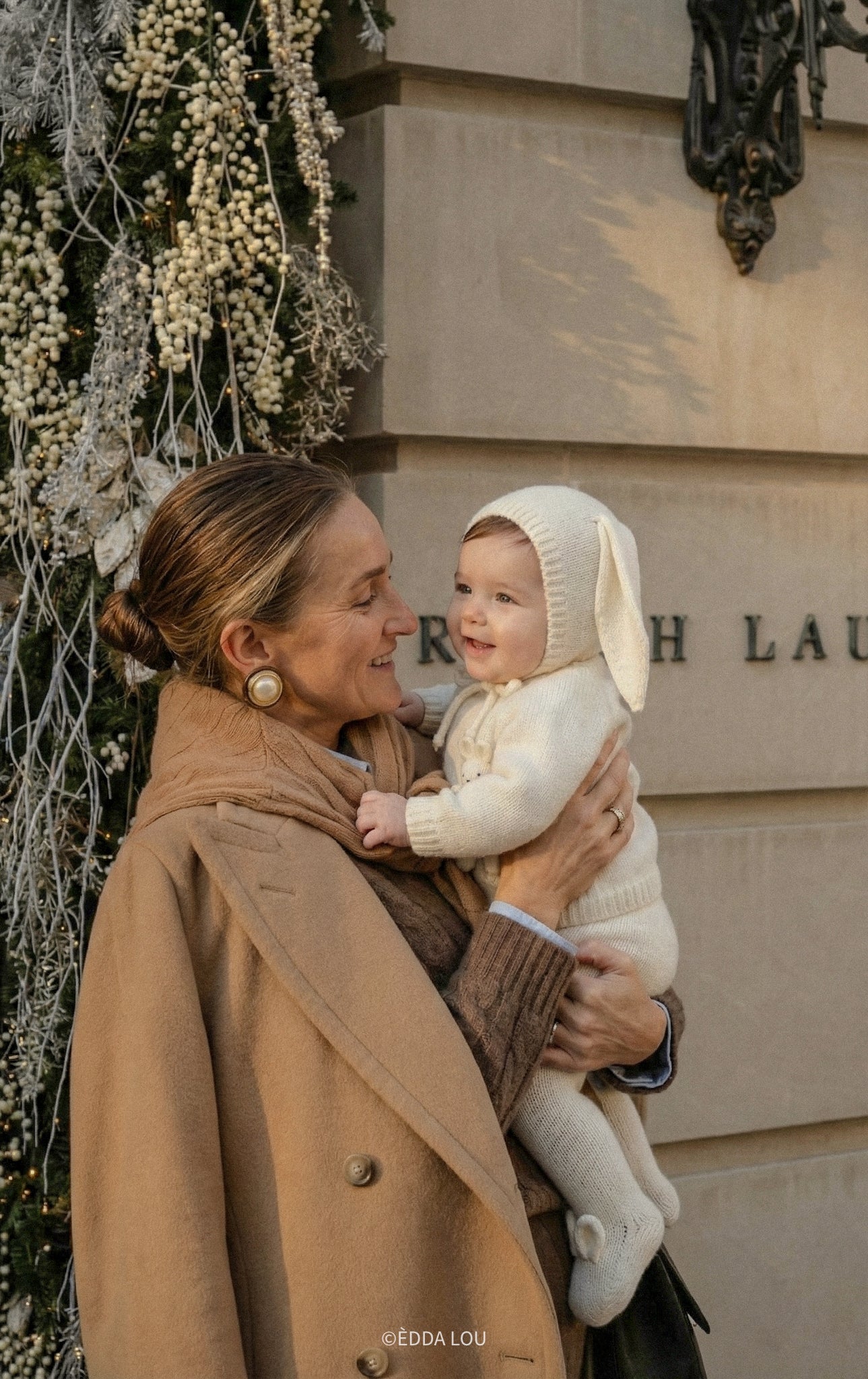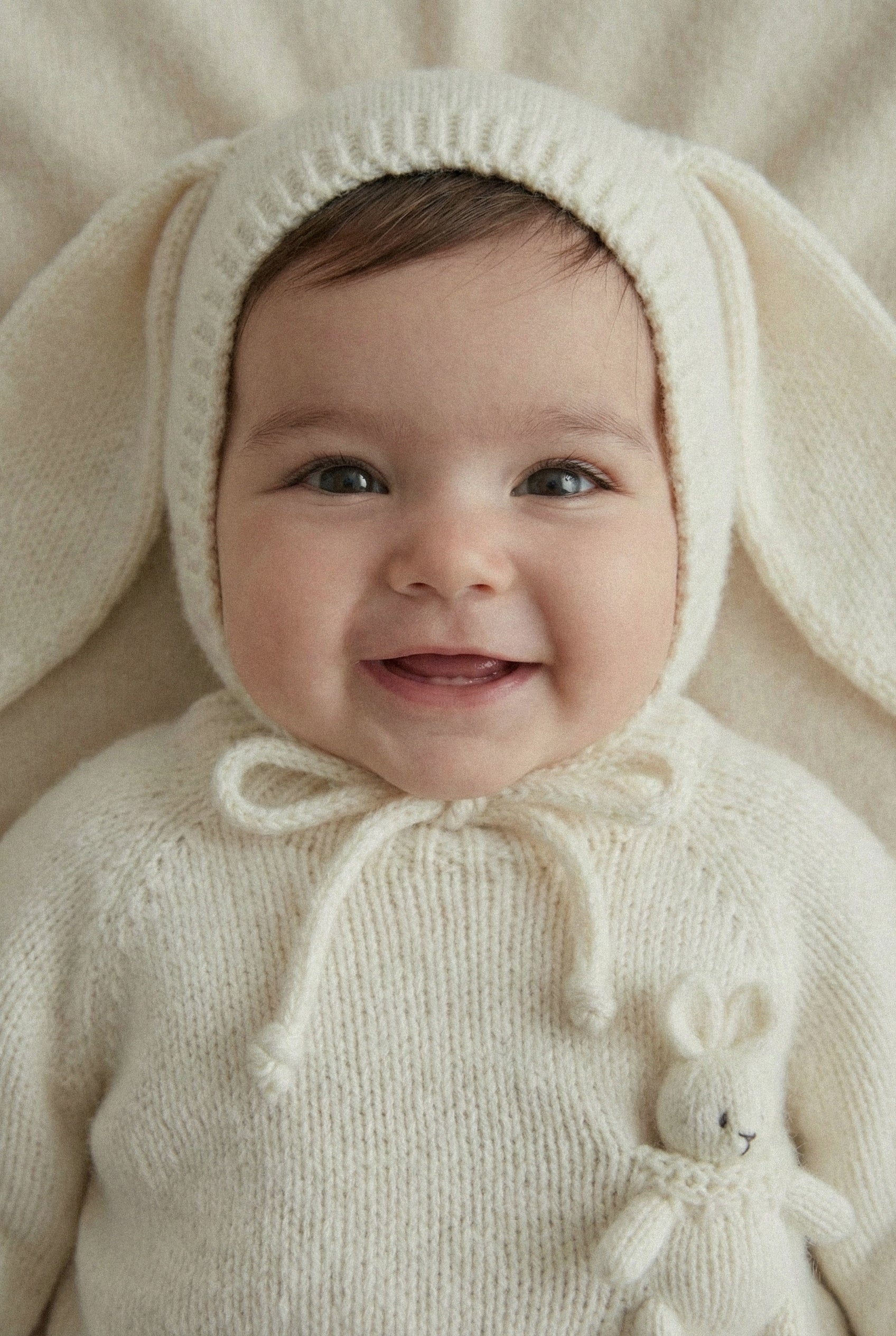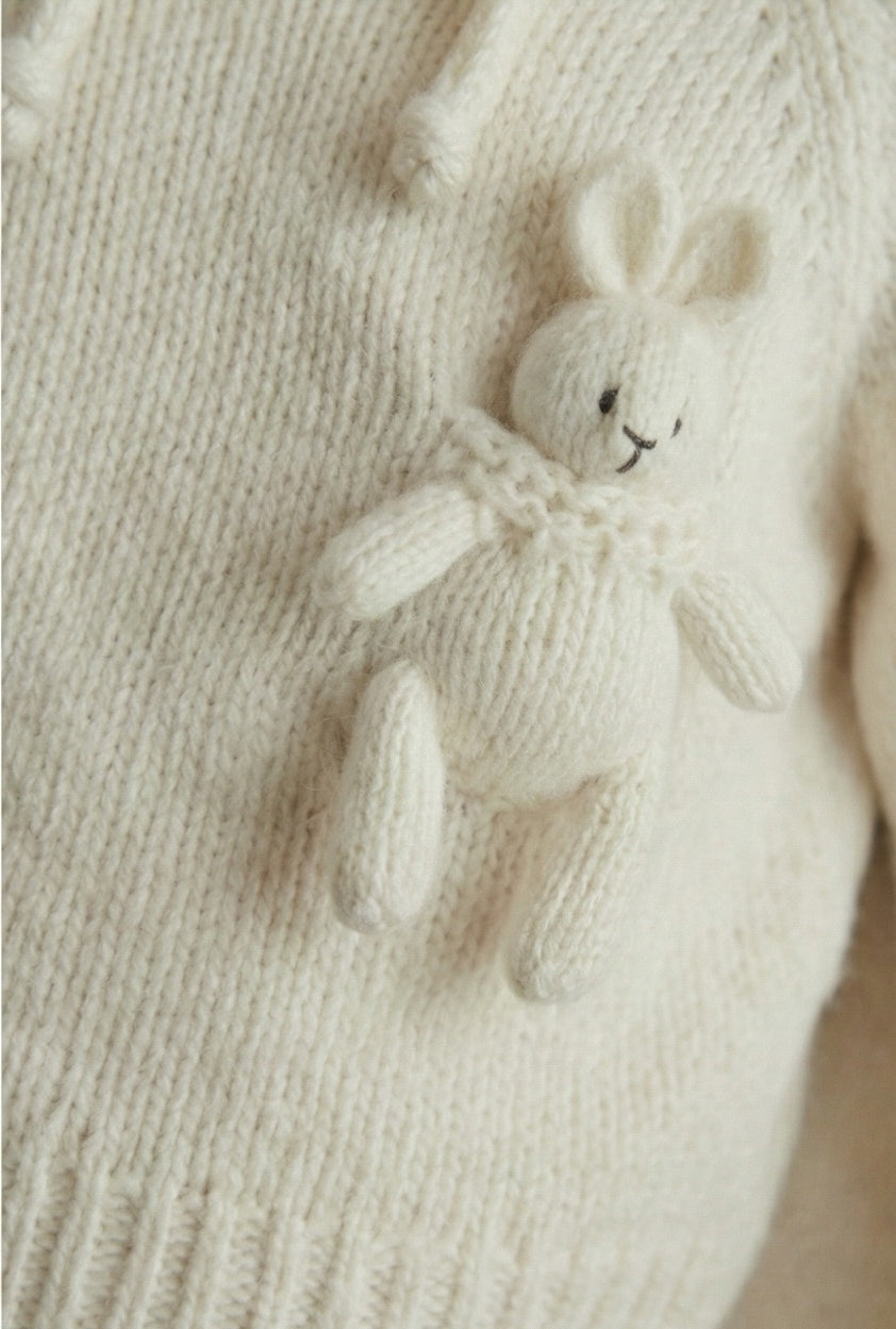The Riley Ensemble is available in white and oat color. It's coming with a Bunny Bonnet, Sweater with a little bunny friend and tights, to keep babies feet soft and snug.